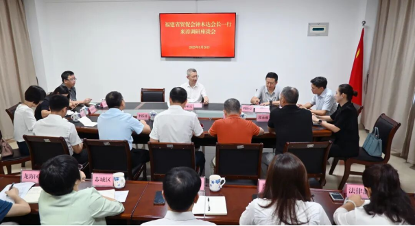 9月26日,省貿(mào)促會(huì)黨組書記、會(huì)長鐘木達(dá)一行來漳調(diào)研并召開座談會(huì)。漳州市恒麗電子有限公司、漳州片仔癀藥業(yè)股份有限公司、漳州市港昌工貿(mào)有限公司、漳州立達(dá)信光電子科技有限公司、福建安泰新能源科技有限公司等企業(yè)代表及市貿(mào)促會(huì)市管干部、各部(室)負(fù)責(zé)人,薌城區(qū)、龍文區(qū)、龍海區(qū)、長泰區(qū)貿(mào)促會(huì)負(fù)責(zé)人參加座談。